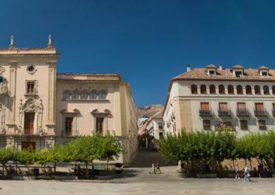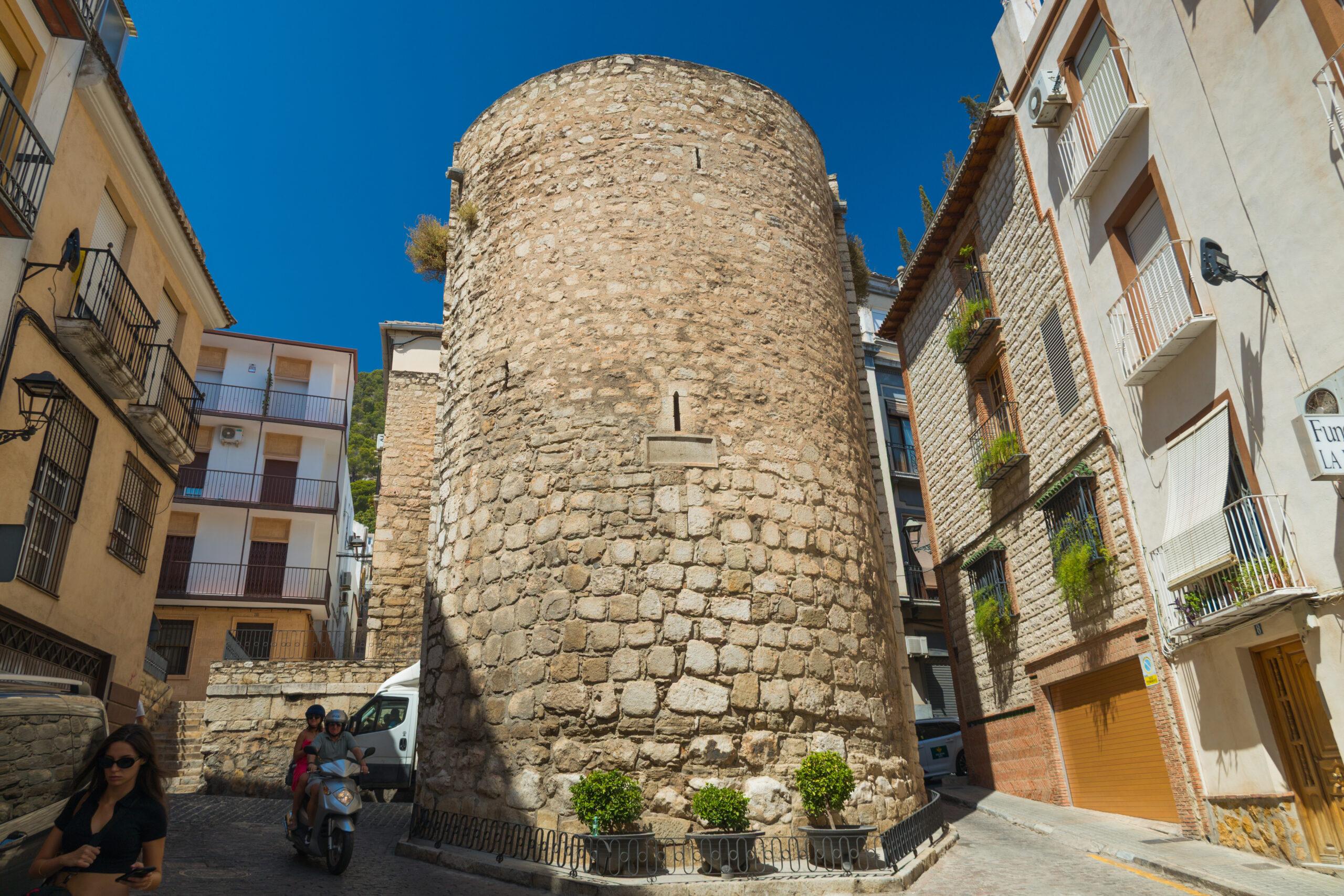A menos de 100m, por la calle Madre de Dios llegamos al Arco de San Lorenzo. Esta construcción es un torreón, con un pasadizo de arco apuntado, sobre el que apoya la cabecera de la desaparecida iglesia de San Lorenzo. En la parte inferior se ubica la capilla de Jesús, un ámbito semicircular del siglo XV, cerrado por media naranja de ladrillo, con exquisitos alicatados geométricos de tradición nazarí y paramentos con yeserías mudéjares, ornamentación que se repite en la planta superior. Cruzamos el arco y continuamos nuestro paseo, por la calle Almendros Aguilar hasta la Iglesia de San Juan, que fue una de las primeras parroquias construidas sobre parte de un conjunto de edificios musulmanes que comprendían una casa, una mezquita y unos baños. La iglesia, muy desfigurada por las reformas, constaba de tres naves con un torreón, llamado Torre del Concejo, lugar de reunión del cabildo municipal en el siglo XV. El antiguo alminar quedó separado del templo al abrirse nuevas vías, situándose en la esquina de la calle Martínez Molina con la de los Caños. En la misma manzana, bajo el edificio de las Antiguas Carnicerías, se alojan restos de salas de los Baños Árabes del Naranjo, restauradas como centro cultural.