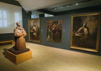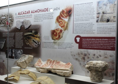 La planta baja se dedica a las colecciones de arqueología, plato fuerte del museo. El recorrido lleva desde los hallazgos prehistóricos a los impresionantes testimonios del primer milenio a. C. Notables son los fondos de época romana, con mosaicos y el magnífico sarcófago paleo-cristiano descubierto en Martos. El período visigodo está representado por elementos arquitectónicos y ajuares funerarios, y el andalusí por cerámica, una espléndida serie de candiles, varios de bronce, y el Tesoro de la Charilla, Alcalá la Real. La planta alta alberga la sección de Bellas Artes, con obras de Berruguete, Alonso Cano, Madrazo y pintores contemporáneos como Manuel Ángeles Ortiz o el más reciente Manuel Kayser Zapata.