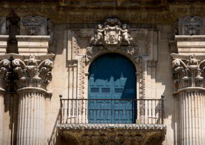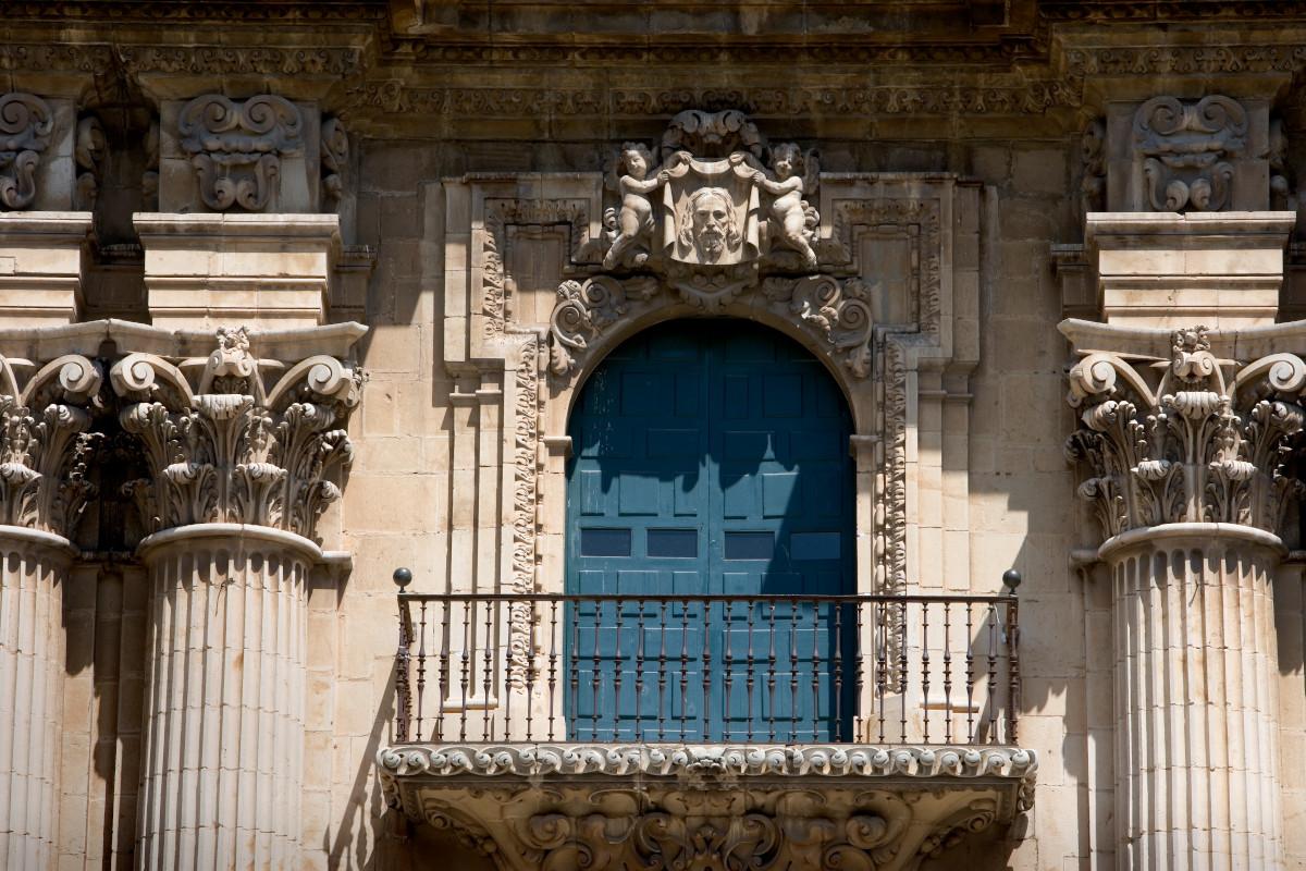 Detalle de la fachada de la Catedral, con el Santo Rostro presidiendo el balcón principal.