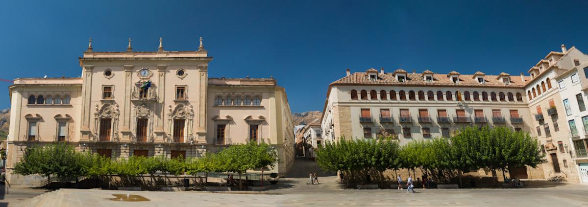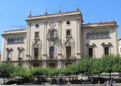 En la misma plaza, y frente a la catedral encontramos el Ayuntamiento de Jaén. El edificio tiene su origen en el siglo XVII, aunque su imagen actual se produce a principios del XIX, de la mano del arquitecto Agustín Eyres, tras el derribo del que fue el Palacio del Duque de Montemar. Las casas consistoriales giennenses se han ubicado en el espacio donde residían los poderes de la ciudad: el civil y el religioso.