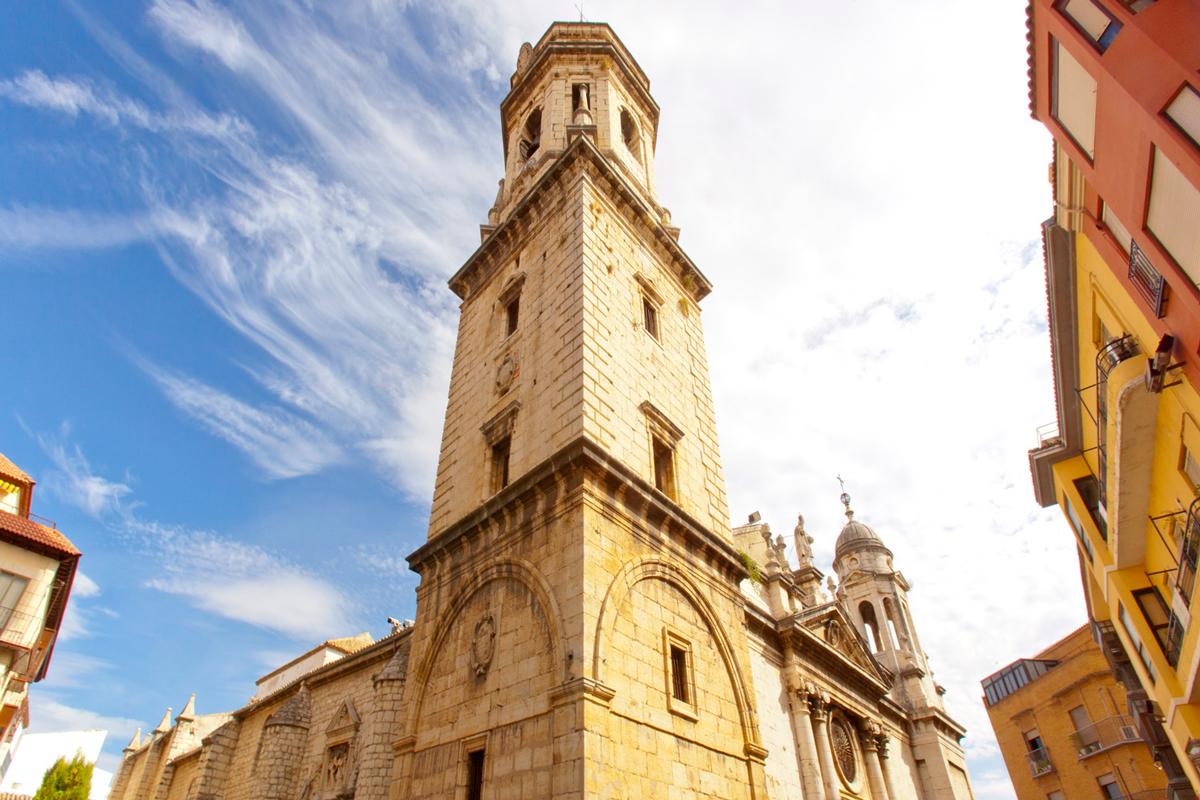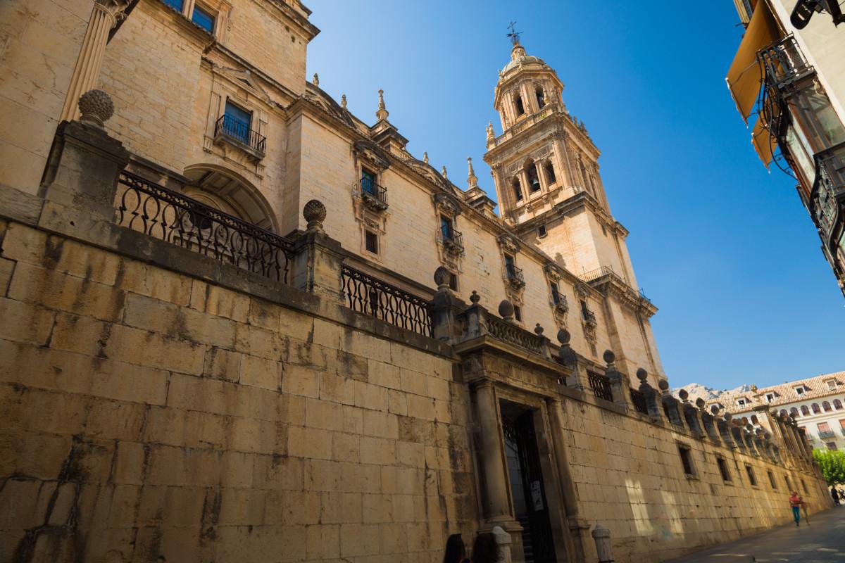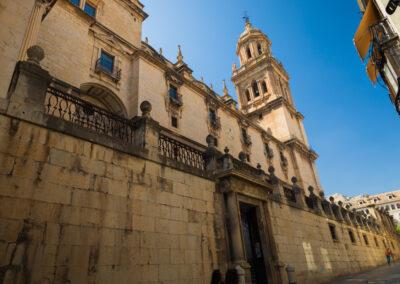 Al descender del castillo, el mirador de la calle Duque nos muestra el majestuoso volumen de la Iglesia Mayor o Catedral, y nos señala el principal hito monumental de Jaén. Tras la conquista se consagró de inmediato la mezquita mayor levantada por los almohades. Hasta mediados del XIV no se acometieron las obras de un nuevo templo, que hubo de edificarse a partir de fines del XV, comenzando un largo proceso constructivo hasta el siglo XVIII. La obra gótica inicial afectó a la cabecera, replanteándose en 1553 el conjunto bajo la dirección de Andrés de Vandelvira, quien concibió una de las piezas más señeras del Renacimiento español. Prosiguieron su labor Alonso Barba y Juan de Aranda, responsables del crucero y la cabecera, rematando el diseño de la imponente fachada Eufrasio López de Rojas en 1668. En el siglo XVIII José Gallego completaba las bóvedas y el coro. La fachada, flanqueada por torres, compone un retablo en piedra con columnas de orden gigante, balaustrada y un brillante despliegue escultórico centrado por la efigie de Fernando III. El cuerpo del edificio articula un rectángulo con cabecera rectilínea, tres naves de amplias luces con bóvedas vaídas, capillas hornacinas y crucero bajo una fastuosa cúpula. A un costado se disponen la Sala Capitular y la Sacristía, los ejemplos más depurados del clasicismo de Vandelvira. A finales del XVIII se yuxtapuso a la cabecera la Iglesia del Sagrario, debida a Ventura Rodríguez. Del patrimonio artístico catedralicio ha de reseñarse el Santo Rostro que preside la capilla mayor, reliquia del lienzo con el que Verónica enjugó la faz de Cristo. Son dignos de mención los sitiales del coro, tallas renacentistas en madera de nogal, la imagen de Nuestro Padre Jesús Nazareno, la popular pintura de la Virgen de las Tijeras y el tenebrario forjado por Bartolomé de Jaén.