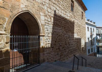 Dejamos la plaza de Santa María para adentramos por la conocida calle Maestra, una vía peatonal en la que nos encontraremos con el antiguo Palacio del Condestable Iranzo del que apenas se conserva uno de sus salones en el que destaca su extraordinaria armadura de madera, con estrella de lacería de veinticuatro puntas y decoración pictórica, en el que distinguimos la presencia entre las zapatas de los escudos del linaje.