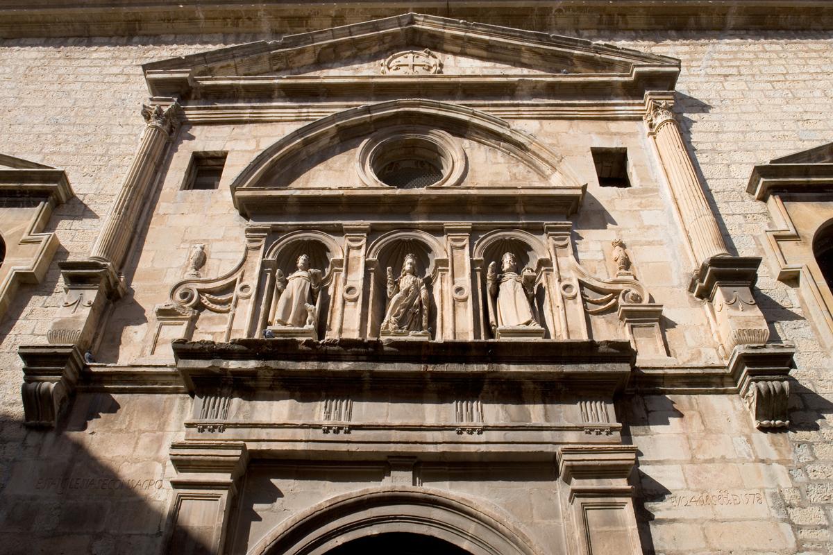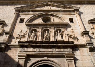 En la portada de acceso al convento, también diseñada por el arquitecto andaluz Juan de Aranda, destaca la figura de la Inmaculada Concepción flanquea por los escudos de su fundador. La sobria portada de acceso al templo está planteada como un arco de triunfo enmarcado por columnas toscanas y apreciamos la existencia de una bella escultura de Santa Clara labrada en piedra por Diego de Landeras.