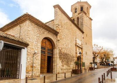 Descendemos buscando el inicio de nuestro paseo y nos encontramos con una plaza que toma su nombre de la lindante Iglesia de San Bartolomé que nos sorprende tras su fachada barroca del siglo XVII, con proporciones modestas que preserva su estructura gótico-mudéjar de tres naves separadas por pilares cilíndricos y armadura de par y nudillo pintada. Una de las joyas que guarda es su pila bautismal, una excepcional pieza de cerámica vidriada verde realizada por posibles talleres ubetenses a finales del siglo XV dentro de un lenguaje gótico-mudéjar.