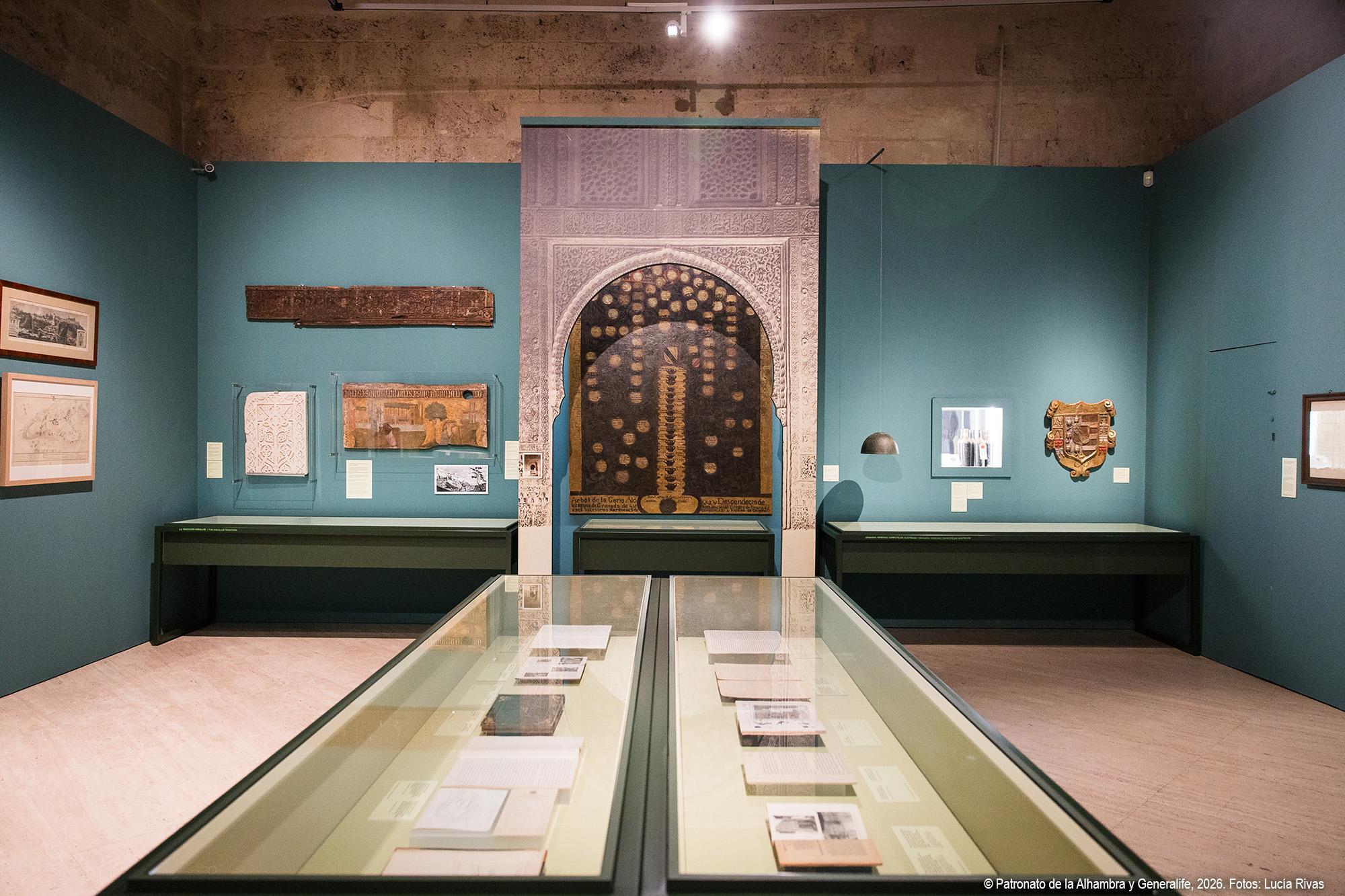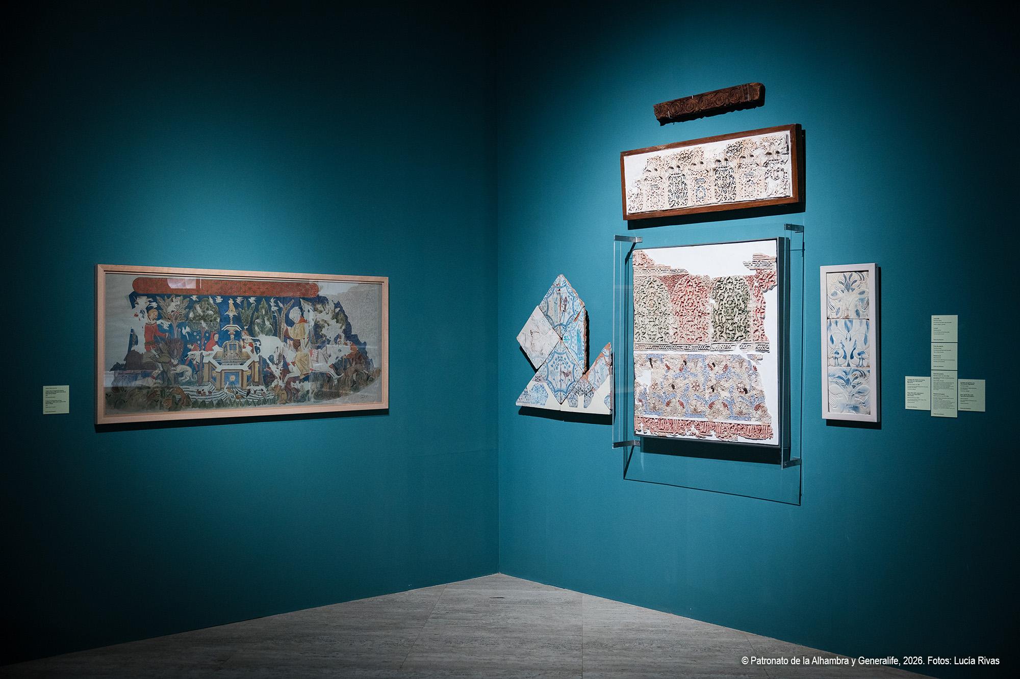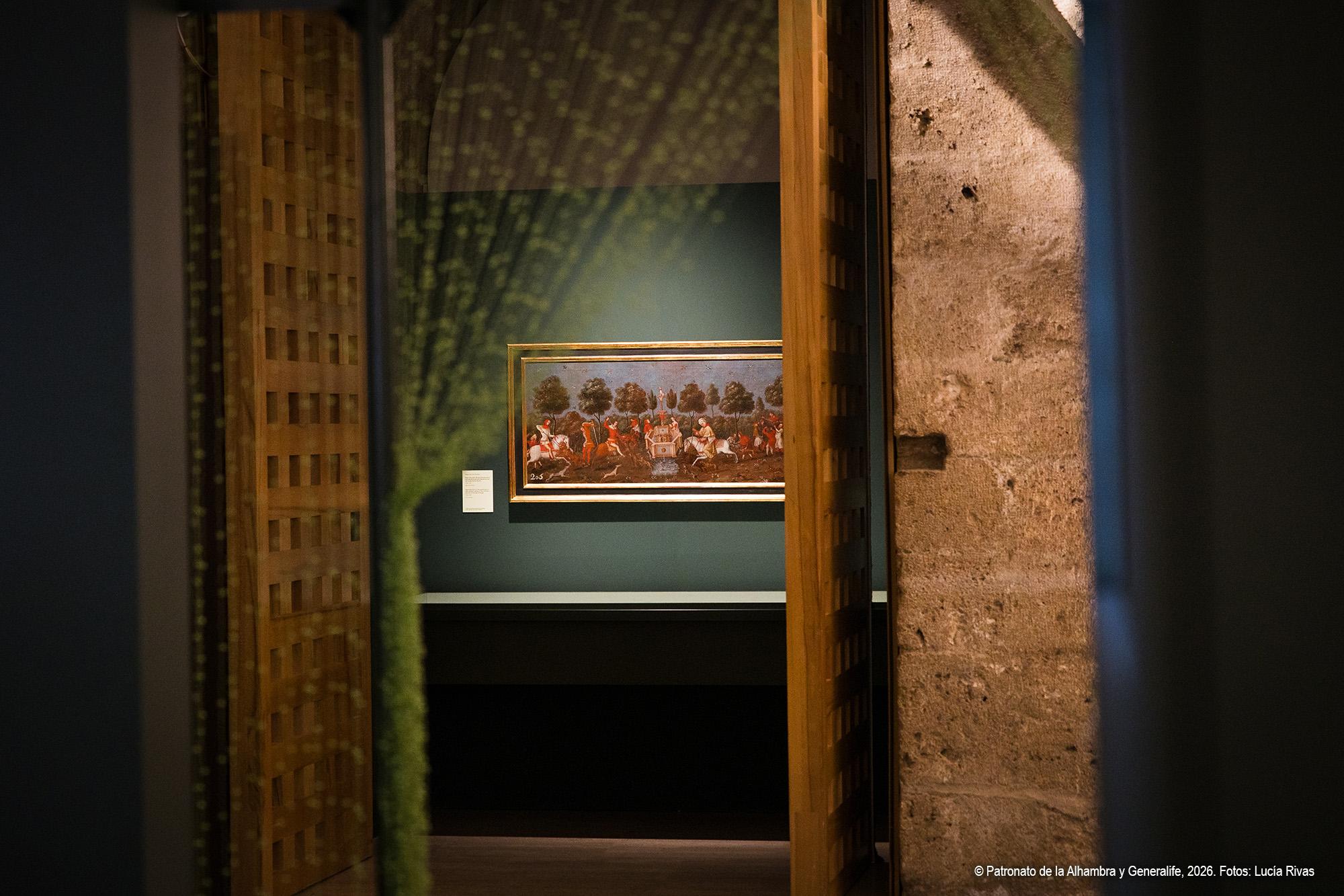El recorrido se inicia con una aproximación al paisaje alhambreño y presenta el Generalife como almunia real nazarí, finca agrícola y de recreo vinculada a la Acequia Real, infraestructura hidráulica esencial que hizo posible la vida y el cultivo en la colina. Se muestra el Generalife no solo como espacio palaciego, sino también como territorio productivo y jardín continuo, cuya huella se ha mantenido a lo largo de los siglos. Reúne esta sección variadas piezas, entre las que destacan una tabla nazarí con representación de dos guerreros ante un paisaje, considerada la imagen más antigua conocida de la Alhambra atribuida al entorno artístico del período de Muḥammad V, junto a otras piezas como el árbol genealógico y pinturas de gran formato de la familia de los Campotéjar, alcaides del Generalife hasta que pasó a manos del Estado en 1921.