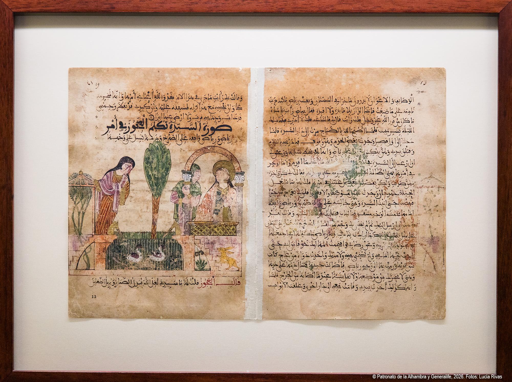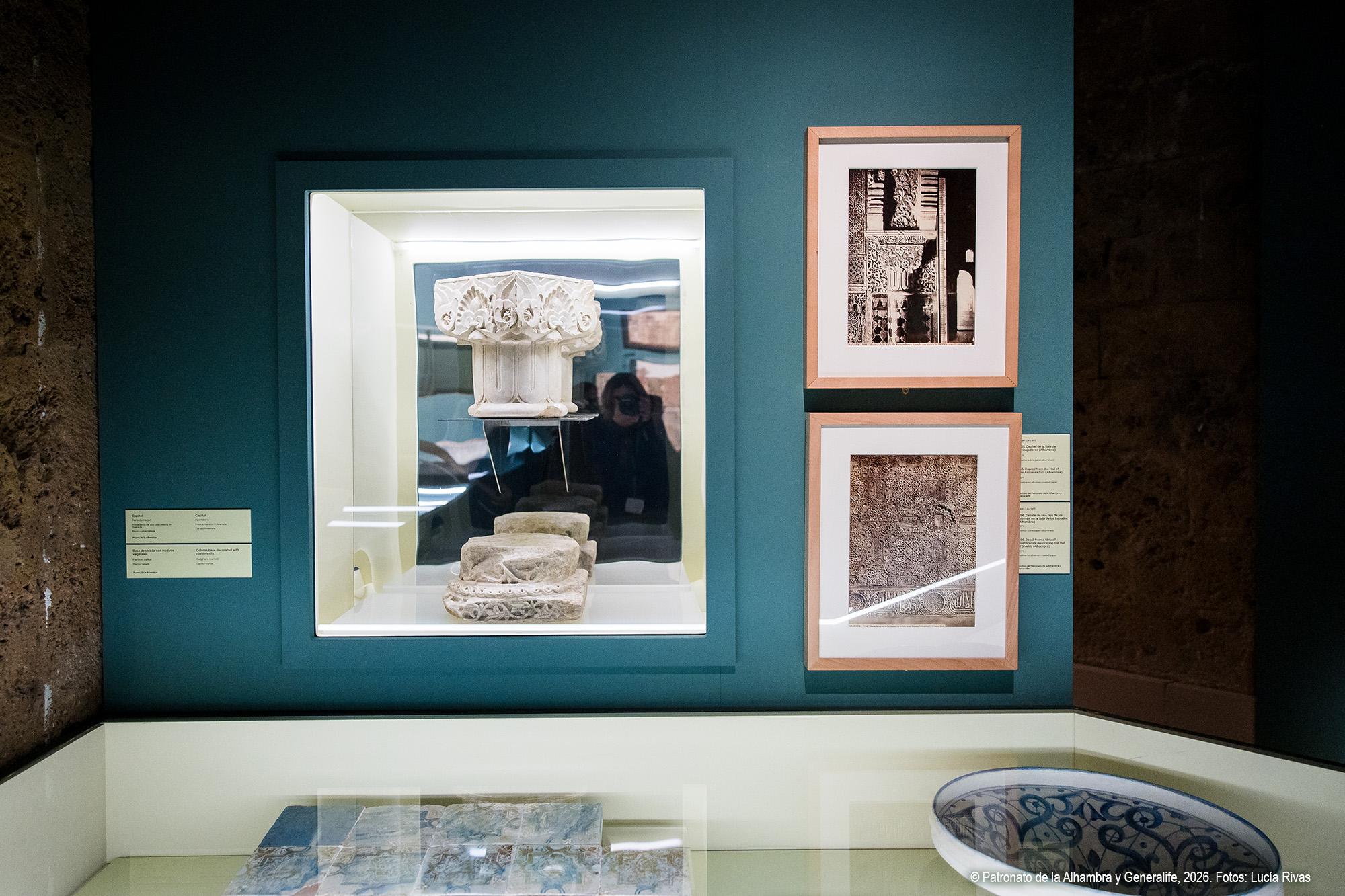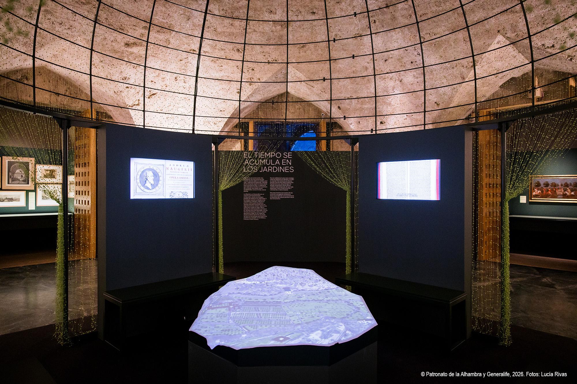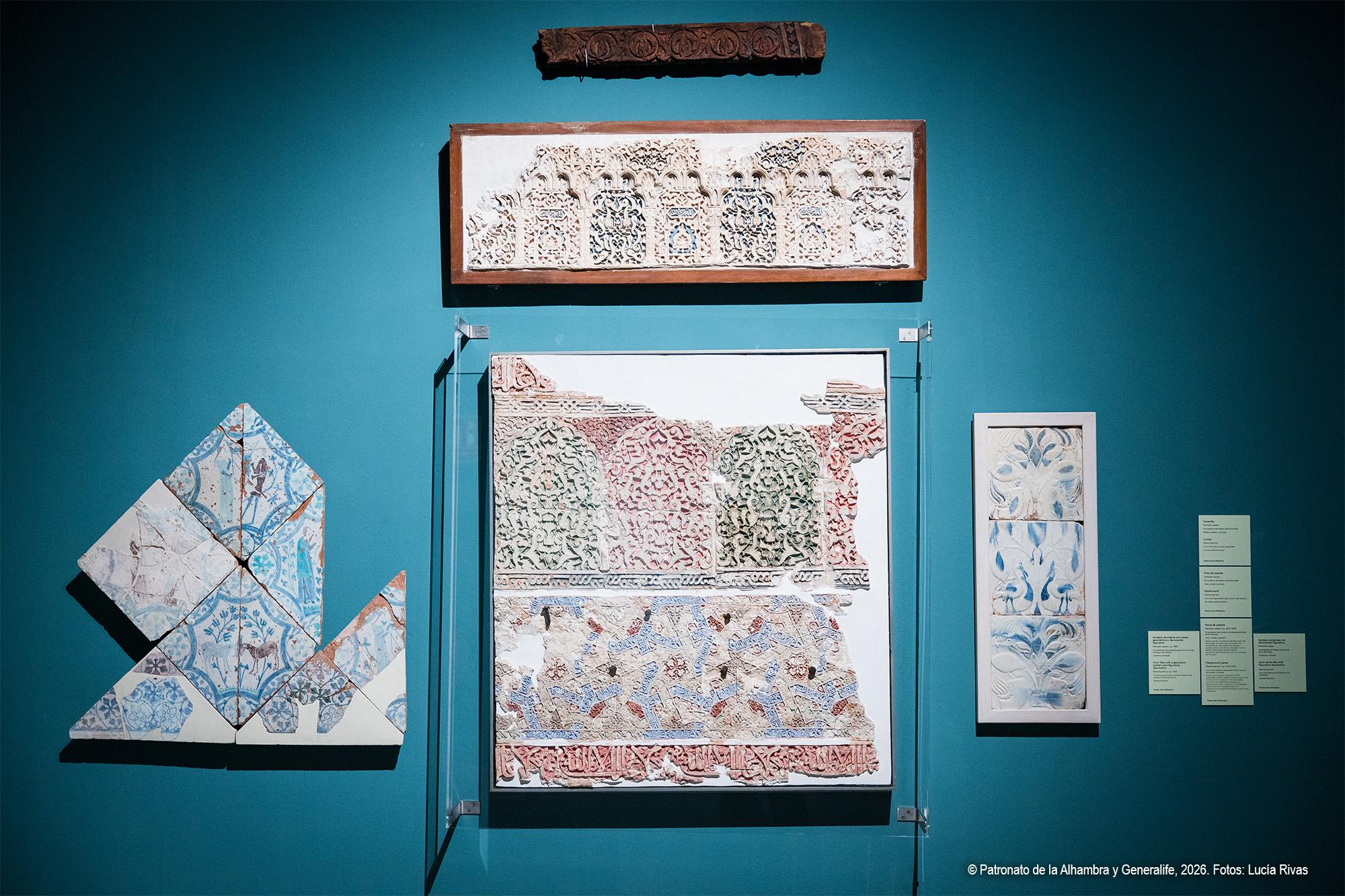 El recorrido se inicia con una aproximación al paisaje alhambreño y presenta el Generalife como almunia real nazarí, finca agrícola y de recreo vinculada a la Acequia Real, infraestructura hidráulica esencial que hizo posible la vida y el cultivo en la colina. Se muestra el Generalife no solo como espacio palaciego, sino también como territorio productivo y jardín continuo, cuya huella se ha mantenido a lo largo de los siglos. Reúne esta sección variadas piezas, entre las que destacan una tabla nazarí con representación de dos guerreros ante un paisaje, considerada la imagen más antigua conocida de la Alhambra atribuida al entorno artístico del período de Muḥammad V, junto a otras piezas como el árbol genealógico y pinturas de gran formato de la familia de los Campotéjar, alcaides del Generalife hasta que pasó a manos del Estado en 1921.