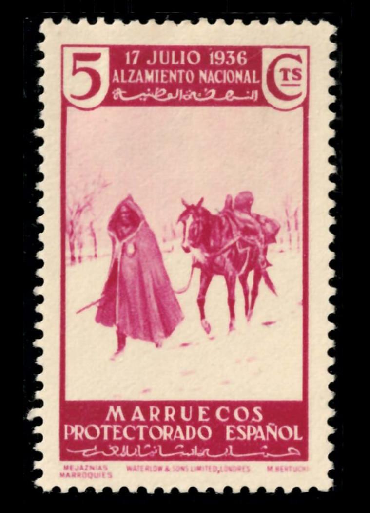 Tras varios intentos fallidos, el 7 de septiembre de 1928 vería la luz la primera serie específica de Marruecos español, Paisajes y monumentos, encargándose Mariano Bertuchi de su diseño. La emisión, que causó admiración por su belleza, fue impresa en calcografía por la firma londinense Thomas de la Rue y estaba compuesta por catorce valores que reproducían seis obras del pintor: Alhucemas, la mezquita de Sidi Yacoub en Alcazarquivir, la Puerta de Larache, Tetuán, Xauen y como colofón una escena de un jinete a caballo para el sello de correo urgente.