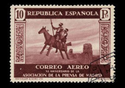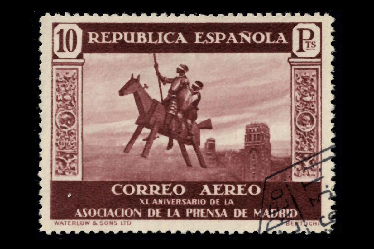 En 1936, el Correo de la II República le encargó varios diseños a Mariano Fortuni para la extensa serie que iba a conmemorar el XL Aniversario de la Asociación de la Prensa. Uno de ellos era este de Clavileño.