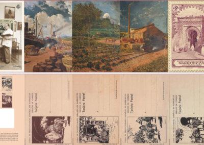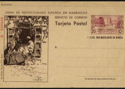 Quizá sea aquí donde podamos apreciar mejor la belleza de su obra pictórica, pues además del motivo del sello (las murallas de Tetuán), en el lado izquierdo de cada tarjeta se reproducía una escena típica tetuaní dibujada a plumilla por el artista. En total eran 72 tarjetas con seis escenas diferentes, todo un catálogo de estampas costumbristas marroquíes plasmadas con maestría por el que fuera su mejor pintor.