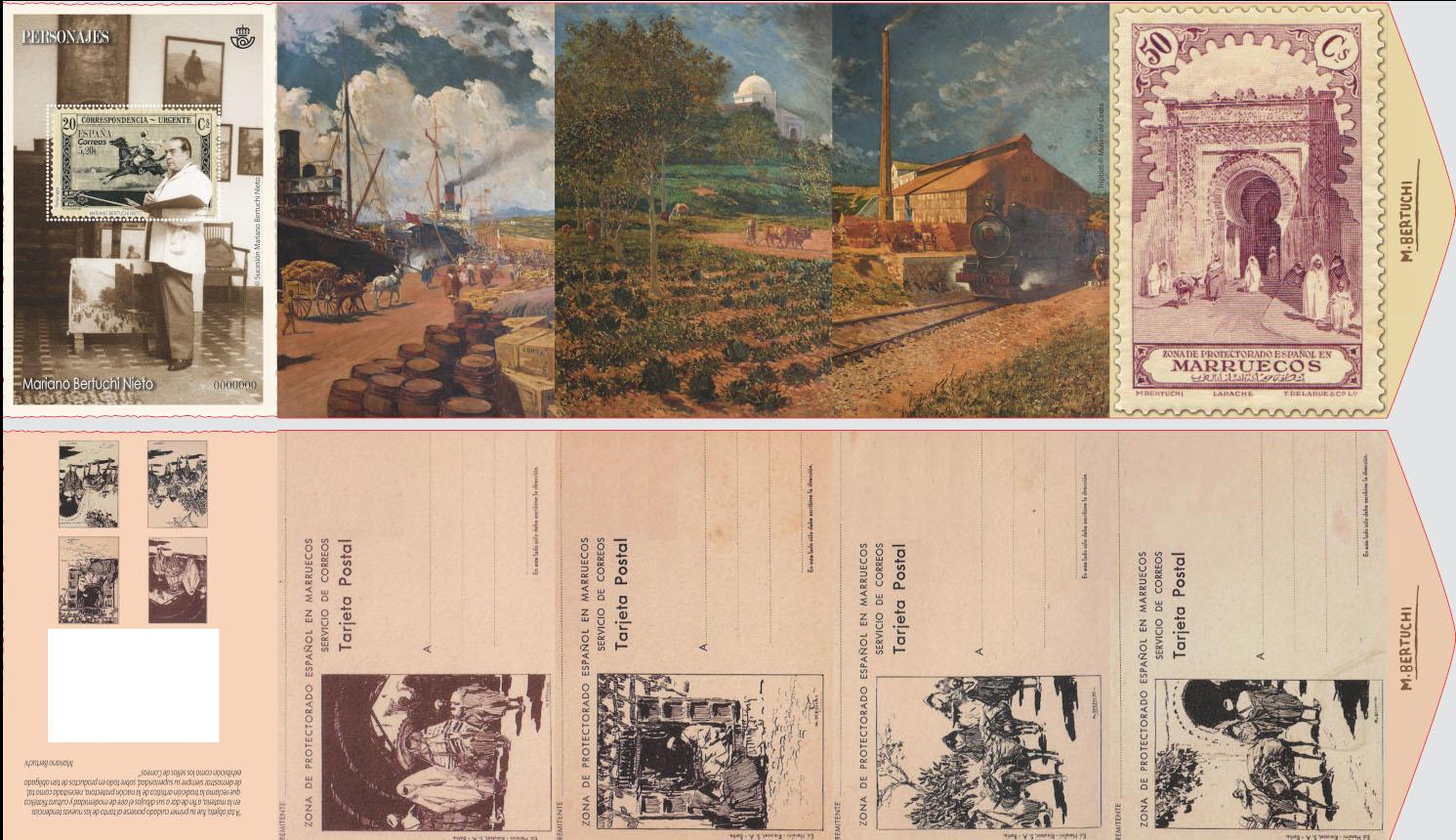 La emisión, muy original, simulaba los desplegables de las viejas tarjetas postales. En el anverso figuraba una fotografía del pintor en su estudio tetuaní junto a su caballete y se reproducía uno de los sellos de la emisión de 1928 (Jinete marroquí), la primera que diseñaría el pintor. También se plasmaban los óleos del tríptico que le encargó el Casino Africano de Ceuta en 1921 (Comercio, Agricultura e Industria). En cuanto a su reverso, aparecía otro sello de la serie de 1928 (Alcazaba de Larache) y diferentes modelos de las tarjetas entero-postales que elaboró para el Protectorado.