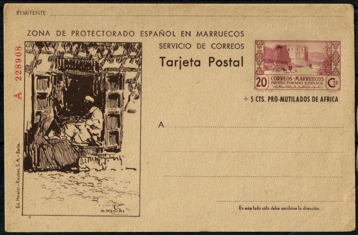 Además de sellos, Bertuchi diseñaría otros elementos filatélicos. Entre ellos merece una mención especial el conjunto de tarjetas entero postales[2] que proyectó, poco conocidas pero muy apreciadas por su belleza, rareza y cotización. Las primeras comenzaron a emitirse en 1933 (Paisajes) y reproducían el sello dedicado a la Mezquita Zauia del Harrak y la Puerta de Ceuta de la serie Vistas y paisajes de 1933-1935. Posteriormente aparecerán: en 1935, Bosque de Ketama, que reproducía el mismo efecto de la serie Vistas y paisajes de 1935-1937; en 1939, nuevamente Bosque de Ketama, con habilitación para 20 céntimos, y Vistas de Tetuán, con el sello de la serie Tipos diversos, de 1939 (calle Sidi Ben Nazar de Tetuán); y, por último, la extensísima Murallas de Tetuán, emitida a lo largo del período 1944-1956.