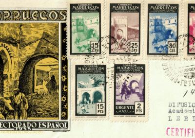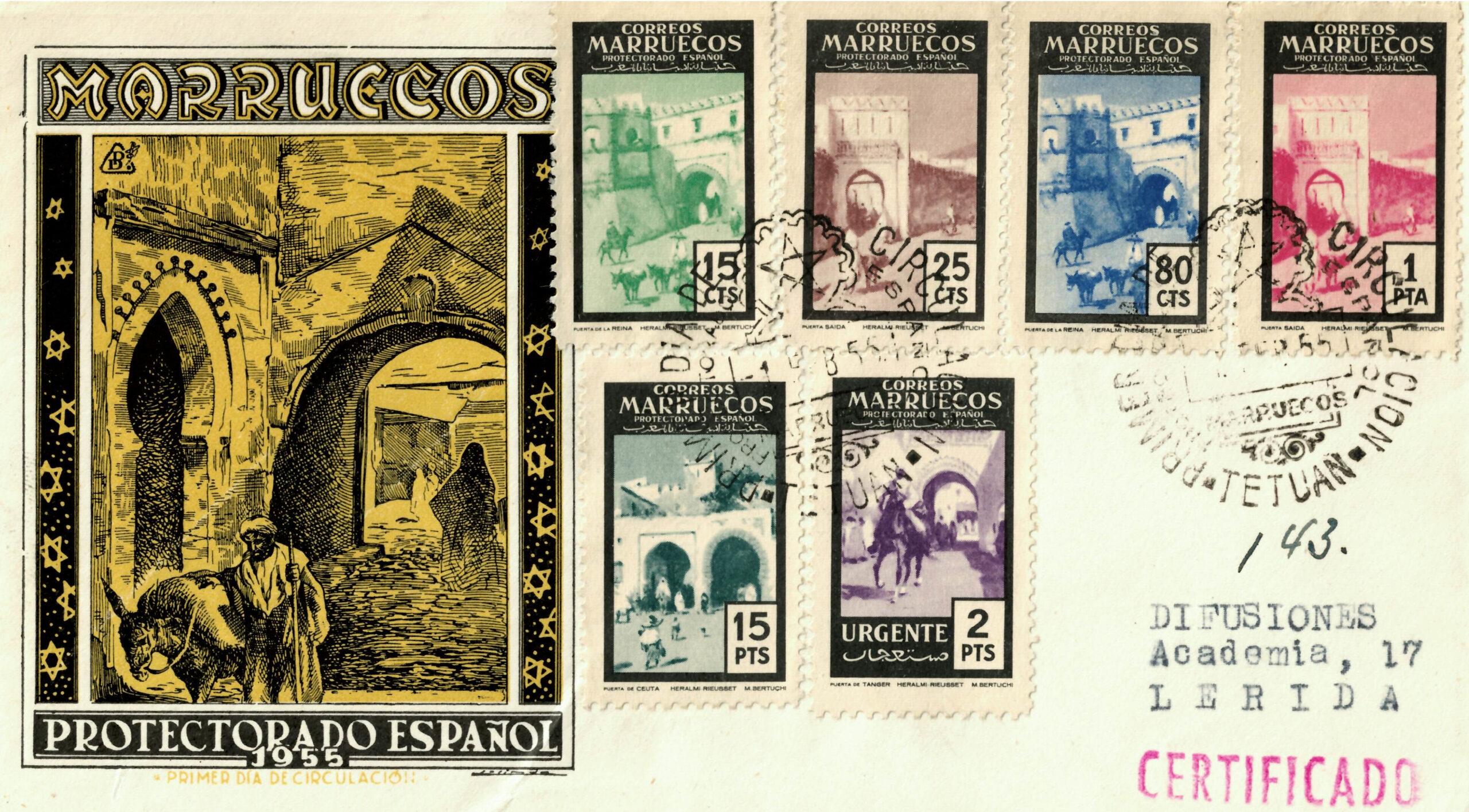 Sobre de primer día de emisión (SPD) de la serie “Puertas Típicas de Tetuán”, circulado desde Tetuán a Lérida.