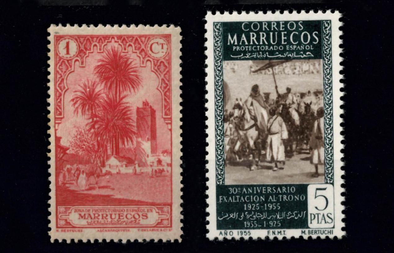 Sellos correspondientes a la primera y a la última serie (ya póstuma) diseñadas por Bertuchi para el Protectorado español de Marruecos. Desde 1928 hasta 1955, el artista granadino fue el autor de todos los sellos propios emitidos por esta administración postal.